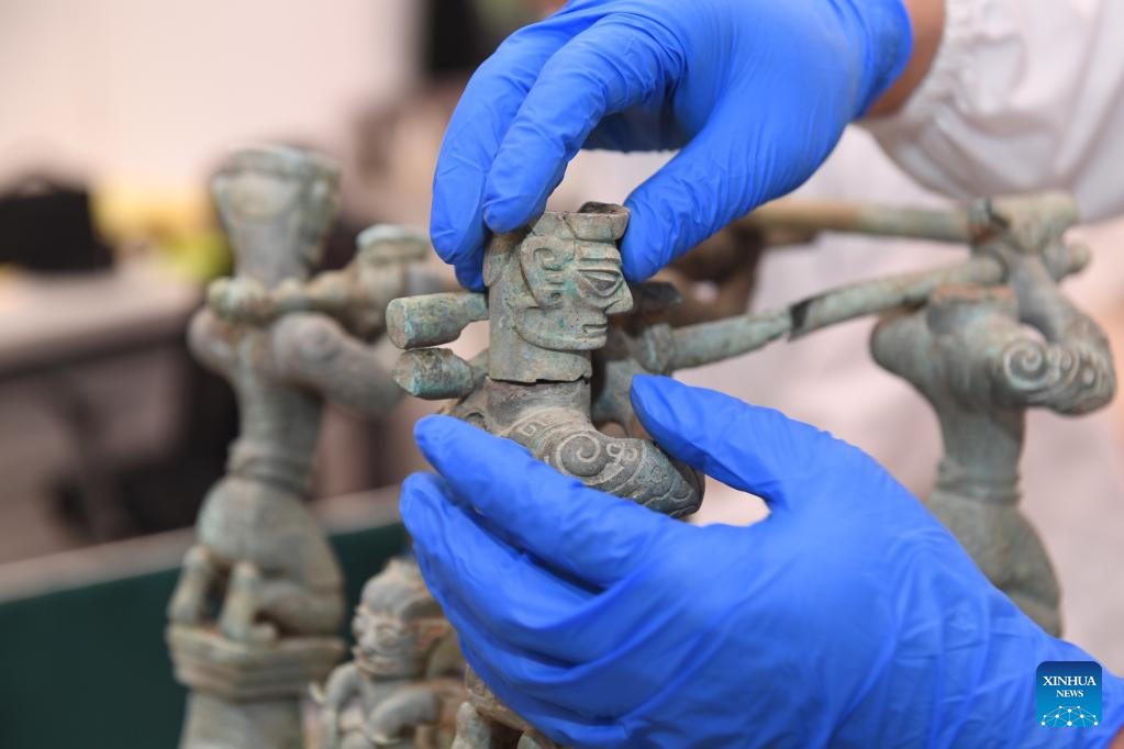 The 55-year-old man in the Sanxingdui Museum of southwest China's Sichuan Province is now skilled in the craft of restoring cultural relics. In the past decades, he and his colleagues have magically transformed numerous unearthed pieces, initially unrecognizable to archaeologists during excavation, into masks, statues, cups, and a towering bronze sacred tree about four meters tall.