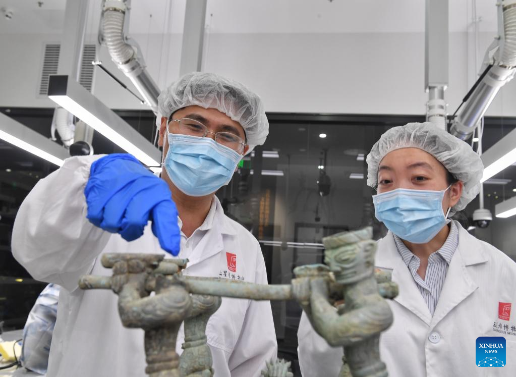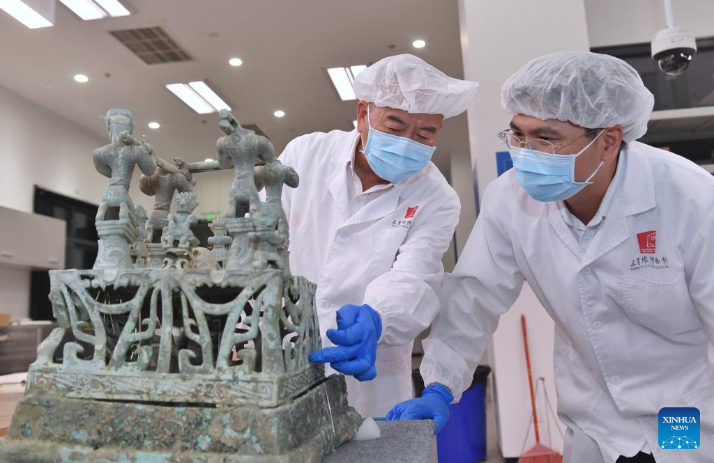 Yu Jian (L) and Xie Li discuss the restoration plan of a bronze altar at Sanxingdui Museum in Guanghan City, southwest China's Sichuan Province, May 30, 2023. (Xinhua/Liu Kun)