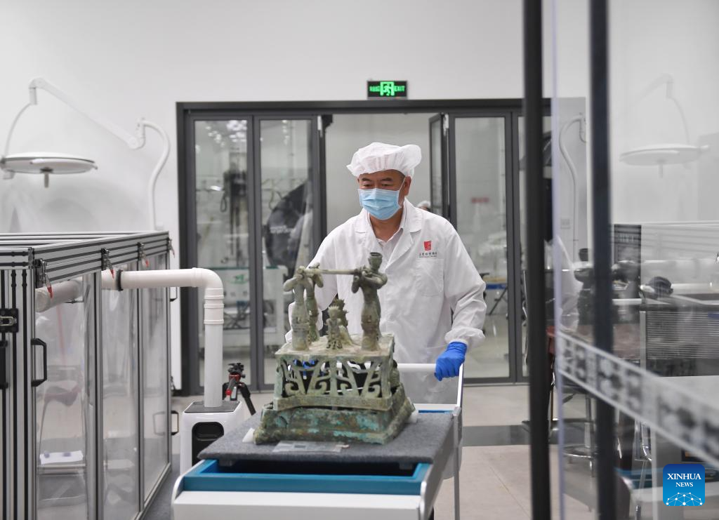 Guo Hanzhong takes out a bronze altar at Sanxingdui Museum in Guanghan City, southwest China's Sichuan Province, May 30, 2023. (Xinhua/Liu Kun)