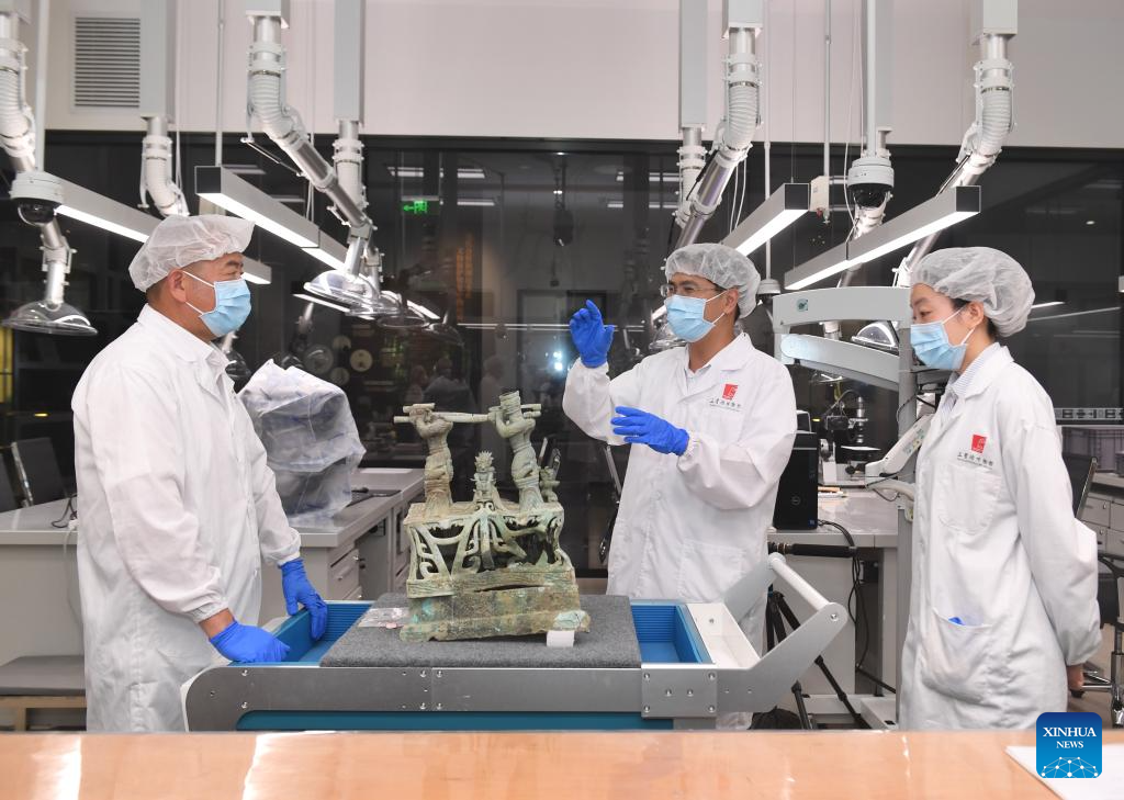 Guo Hanzhong (L), Yu Jian (C) and Xie Li discuss the restoration plan of a bronze altar at Sanxingdui Museum in Guanghan City, southwest China's Sichuan Province, May 30, 2023. (Xinhua/Liu Kun)