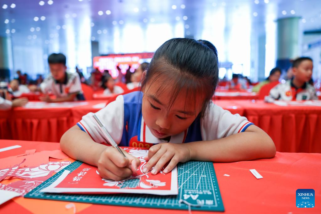 A child makes paper cutting works during a paper cutting competition in Jinan, east China's Shandong Province, June 10, 2023. Saturday marks this year's Cultural and Natural Heritage Day in China, with the theme focusing on cultural relics protection and utilization, as well as cultural confidence and strength. (Xinhua/Zhu Zheng)