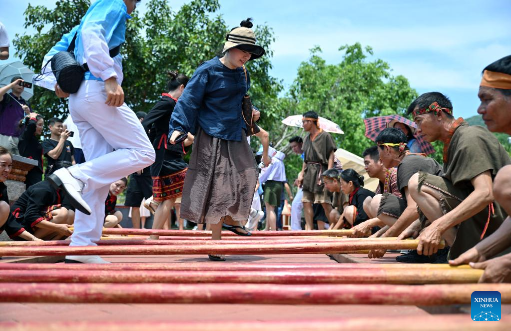 Tourists experience folk dance of Li ethnic group during activities to celebrate China's Cultural and Natural Heritage Day in Sanya, south China's Hainan Province, June 10, 2023. Saturday marks this year's Cultural and Natural Heritage Day in China, with the theme focusing on cultural relics protection and utilization, as well as cultural confidence and strength. (Xinhua/Guo Cheng)