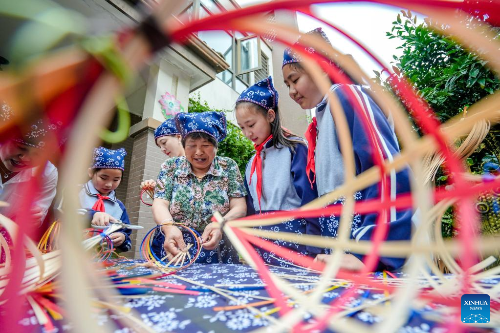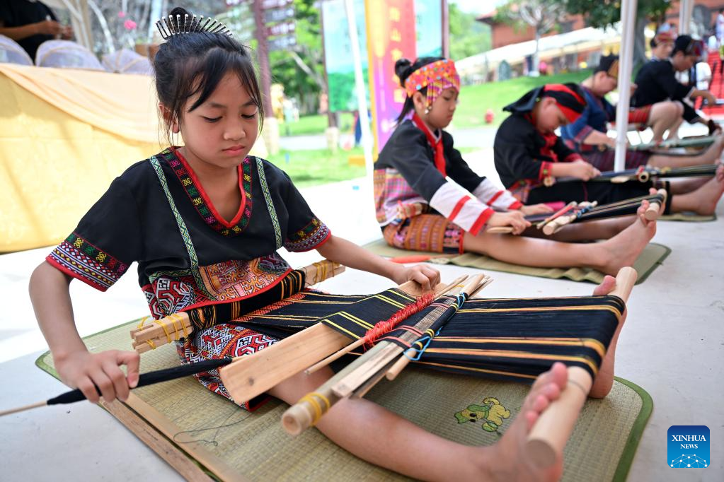 Children demonstrate ethnic Li textile weaving during activities to celebrate China's Cultural and Natural Heritage Day in Sanya, south China's Hainan Province, June 10, 2023. Saturday marks this year's Cultural and Natural Heritage Day in China, with the theme focusing on cultural relics protection and utilization, as well as cultural confidence and strength. (Xinhua/Guo Cheng)