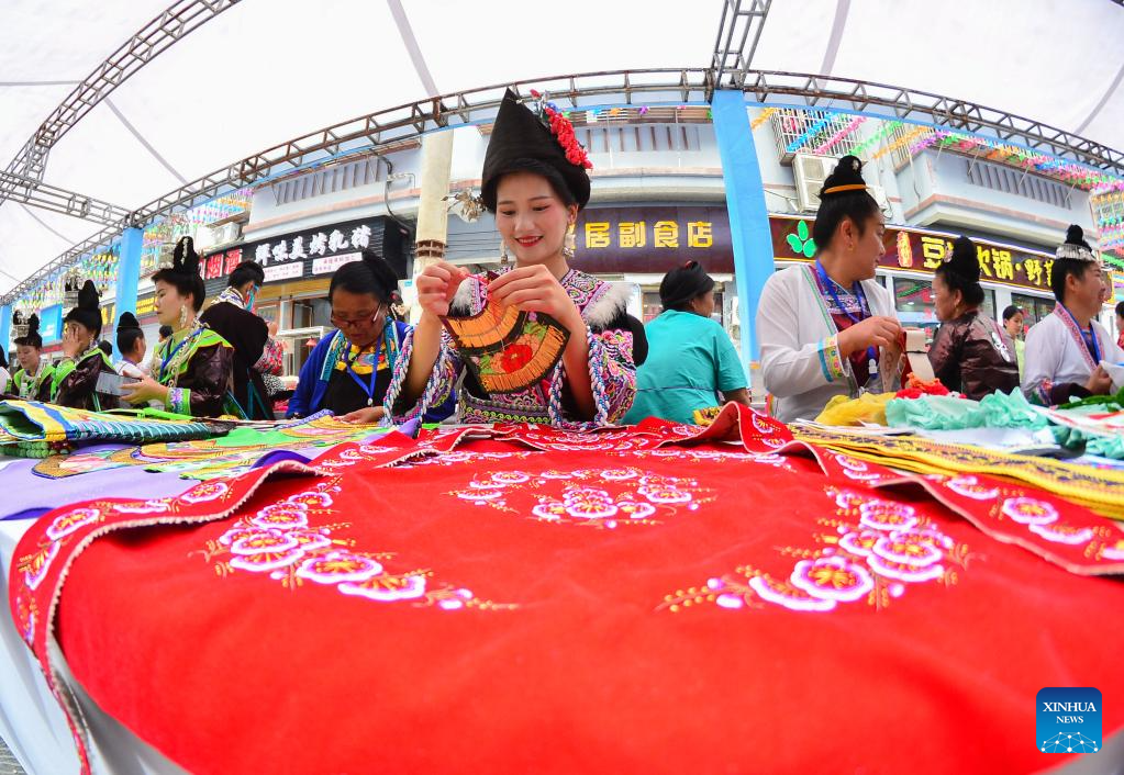 A woman demonstrates embroidery skills during activities to celebrate China's Cultural and Natural Heritage Day in Congjiang County, southwest China's Guizhou Province, June 10, 2023. Saturday marks this year's Cultural and Natural Heritage Day in China, with the theme focusing on cultural relics protection and utilization, as well as cultural confidence and strength. (Photo by Lu Zhongnan/Xinhua)