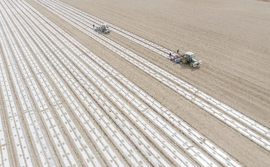 Seed drills guided by the BeiDou Navigation Satellite System works in a field in Changxing village, Tarim township, Kuqa, northwest China's Xinjiang Uygur autonomous region, April 13, 2023. (People's Daily Online/Yuan Huanhuan)