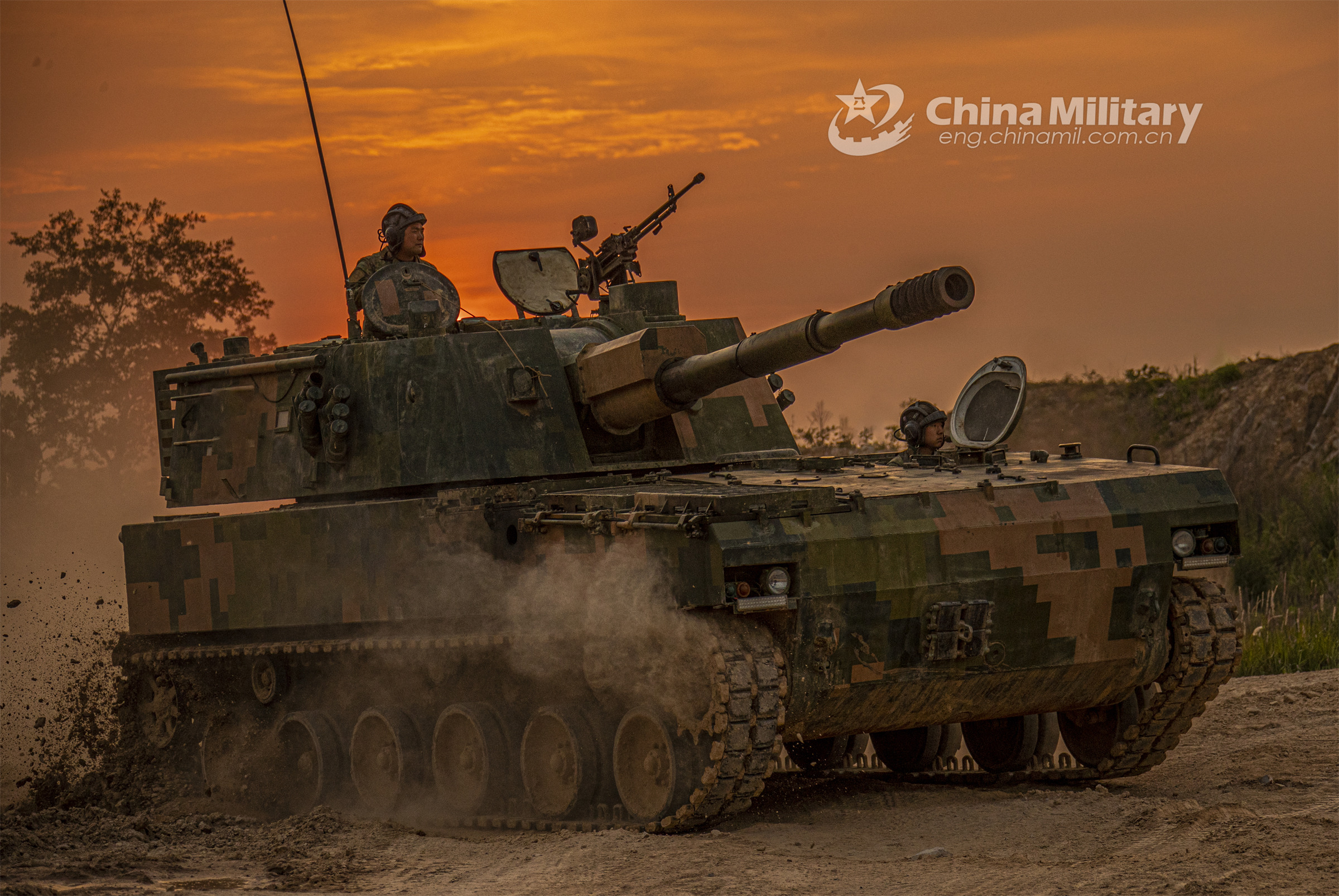 Soldiers assigned to an artillery element of a brigade under the PLA 71st Group Army maneuver a main battle tank to the battlefield at twilight during a round-the-clock live-fire training exercise in late May, 2023. (eng.chinamil.com.cn/Photo by Wan Zhiqi)