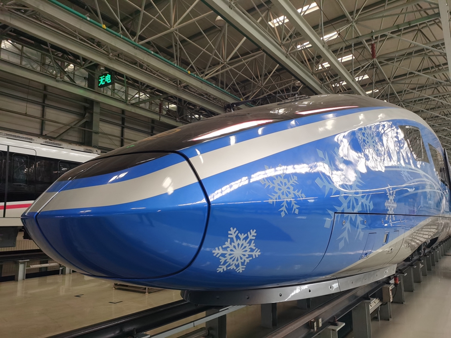 This photo taken on June 12, 2023 shows the "Fuxing" high-speed train themed on winter sports in CRRC Changchun Railway Vehicles Co., Ltd in Changchun, northeast China's Jilin Province. (People's Daily Online/Zhang Kaiwei)