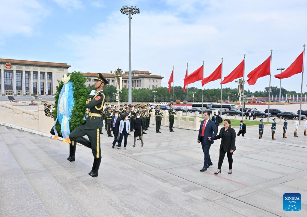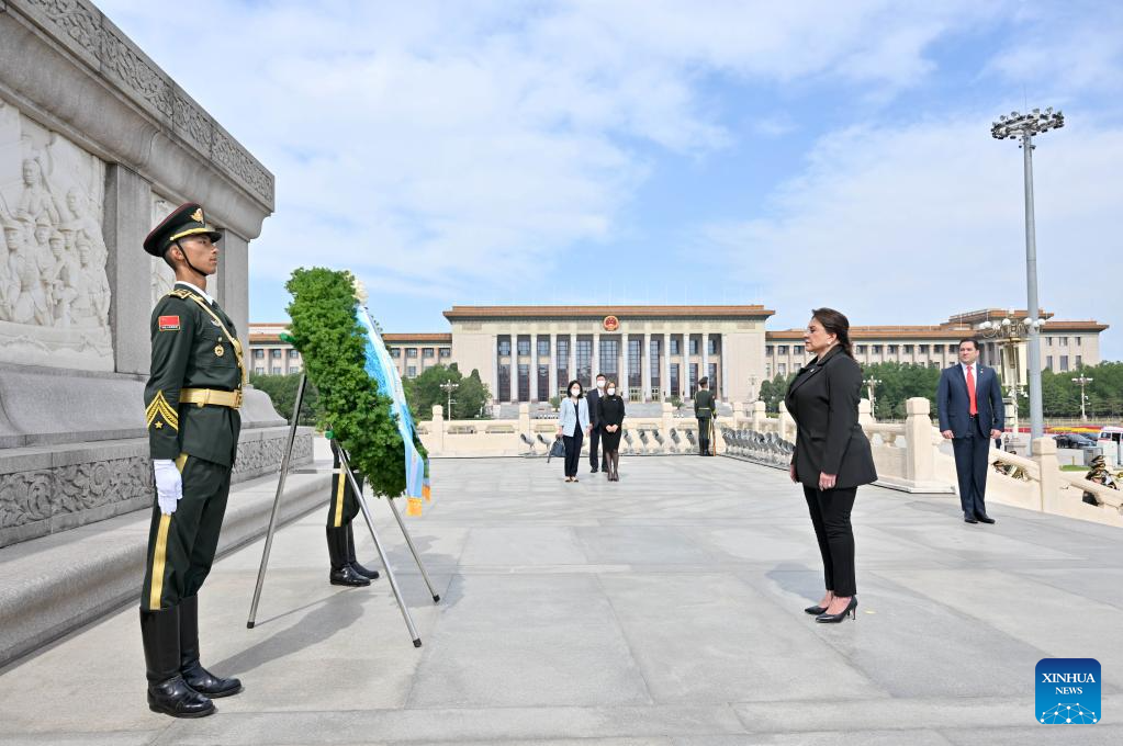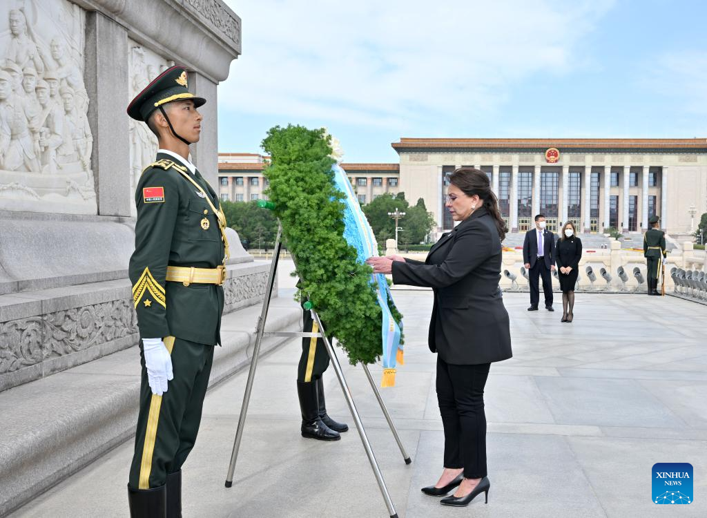President of the Republic of Honduras Iris Xiomara Castro Sarmiento lays a wreath at the Monument to the People's Heroes on the Tian'anmen Square in Beijing, capital of China, June 12, 2023. (Xinhua/Yue Yuewei)