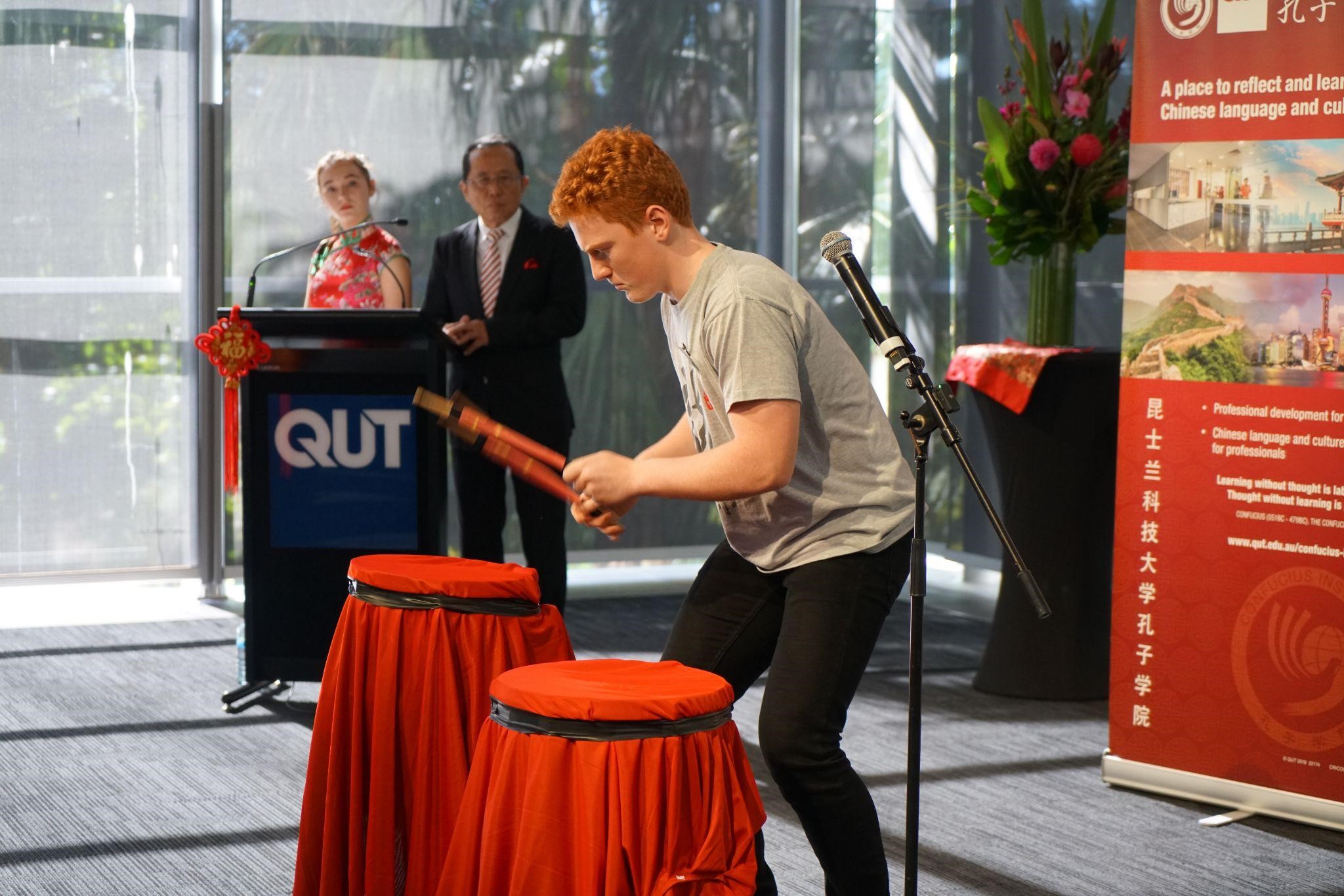 Daniel Osborne from New South Wales performs on the Chinese drums at the 16th “Chinese Bridge” Chinese Proficiency Competition for Foreign Secondary School Students in Australia on June 9, 2023. (Photo/Zhengzheng Huang)