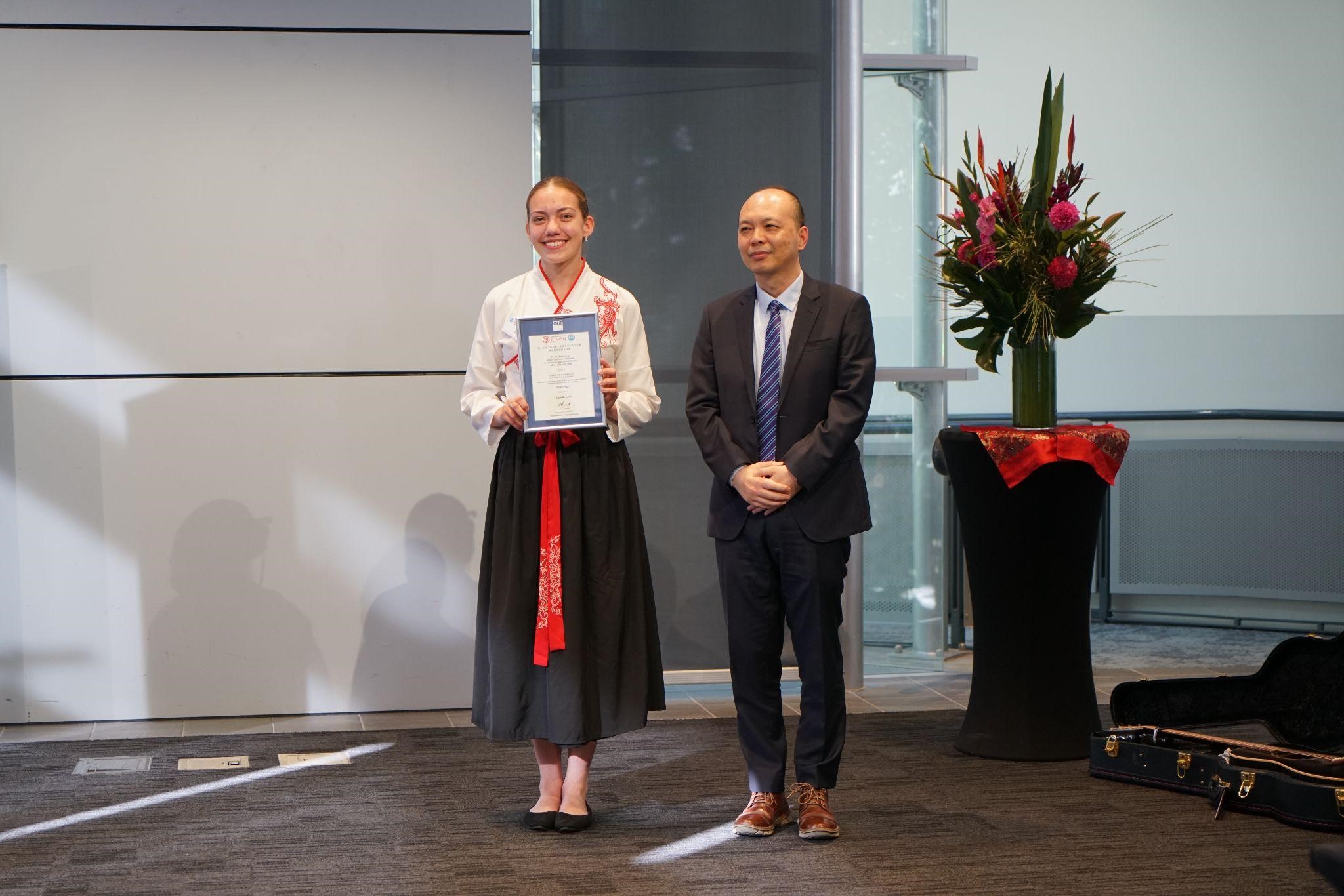 Deputy Consul-General of the Chinese Consulate-General in Brisbane presents the award to Isabelle Lord, the champion of the 16th "Chinese Bridge" Chinese Proficiency Competition for Foreign Secondary School Students in Australia on June 9, 2023. (Photo/Zhengzheng Huang)
