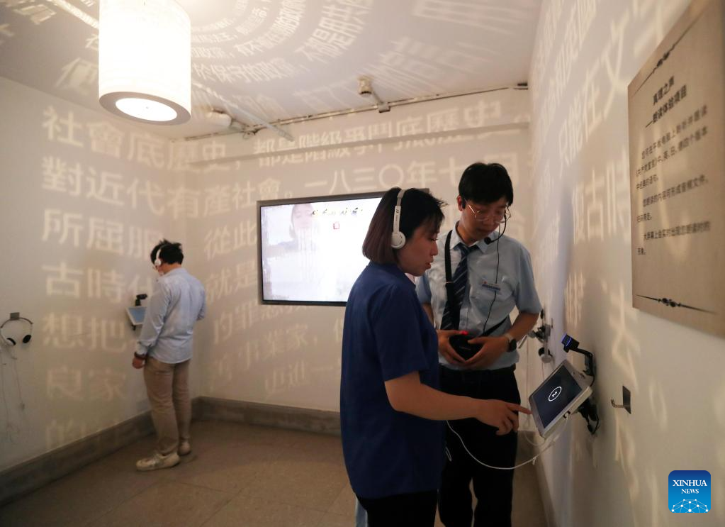 Visitors read The Communist Manifesto via the digital display at the site of Youxin Printing Office in east China's Shanghai, June 9, 2023.
