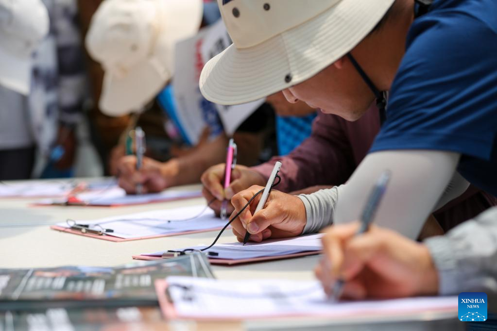 People sign their names to protest against Japan's planned discharge of radioactive wastewater in Seoul, South Korea, June 12, 2023. Thousands of South Korean fishermen gathered on Monday near the parliamentary building in Seoul to clamor against Japan's planned discharge of radioactive wastewater from its crippled Fukushima Daiichi nuclear power plant into the Pacific Ocean. (Xinhua/Wang Yiliang)
