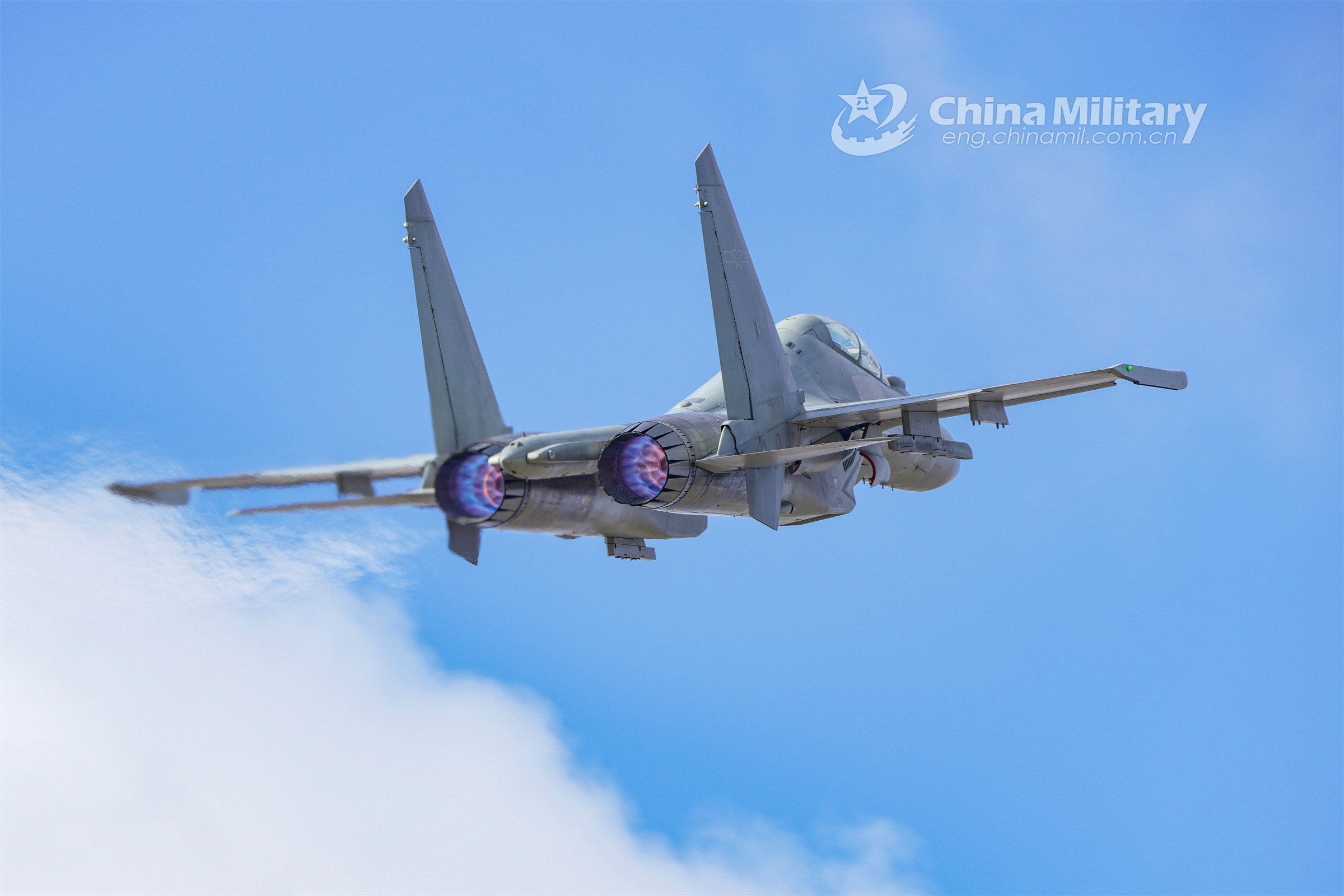 A fighter jet attached to an aviation brigade of the air force under the PLA Southern Theater Command soars into the sky during a recent round-the-clock flight training exercise. (eng.chinamil.com.cn/Photo by Wang Guoyun)