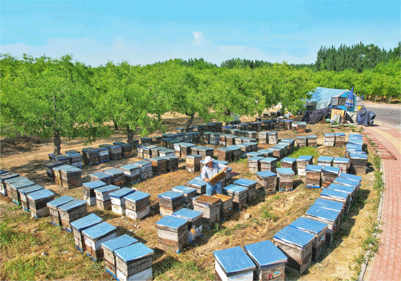 A beekeeper works in a jujube orchard in Zhuji township, Laoling, east China's Shandong Province. (Photo/Jia Peng)