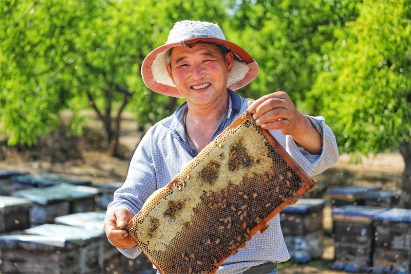 A beekeeper presents a beehive at a jujube orchard in Zhuji township, Laoling, east China's Shandong Province. (Photo/Jia Peng)