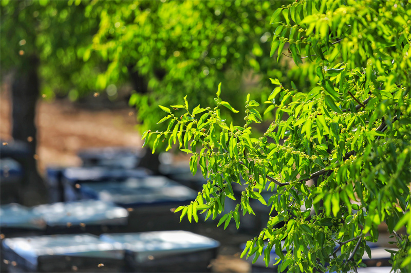 Bees collect honey at a jujube orchard in Zhuji township, Laoling, east China's Shandong Province. (Photo/Jia Peng)