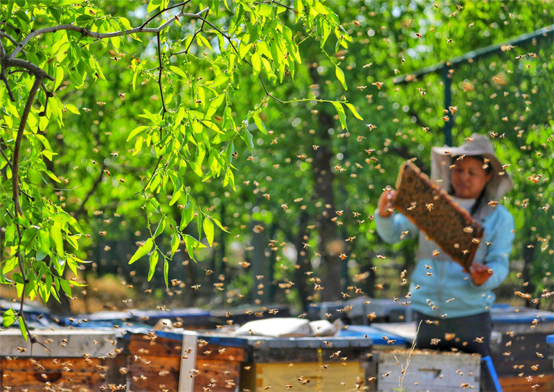 A beekeeper works at a jujube orchard in Zhuji township, Laoling, east China's Shandong Province. (Photo/Jia Peng)