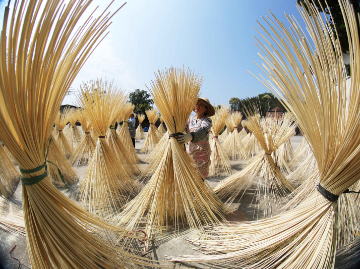 A village worker dries strips of bamboo in Chishui, Guizhou Province, on April 15. Chishui's bamboo growing and value-adding industry makes products including chopsticks, mats and flooring (XINHUA)