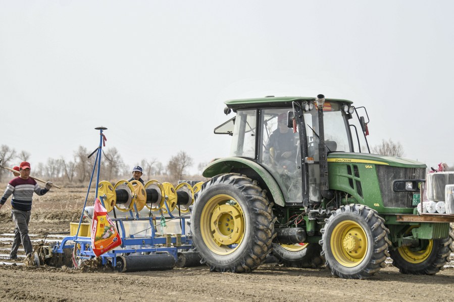 A seeding machine equipped with the Beidou Navigation Satellite System is at work in a cotton field in Yuli County, northwest China's Xinjiang Uygur Autonomous Region, March 30, 2023. (Xinhua/Wang Fei)