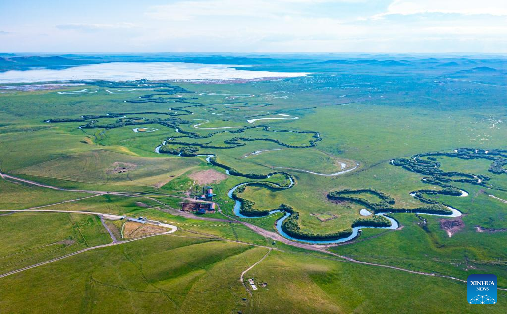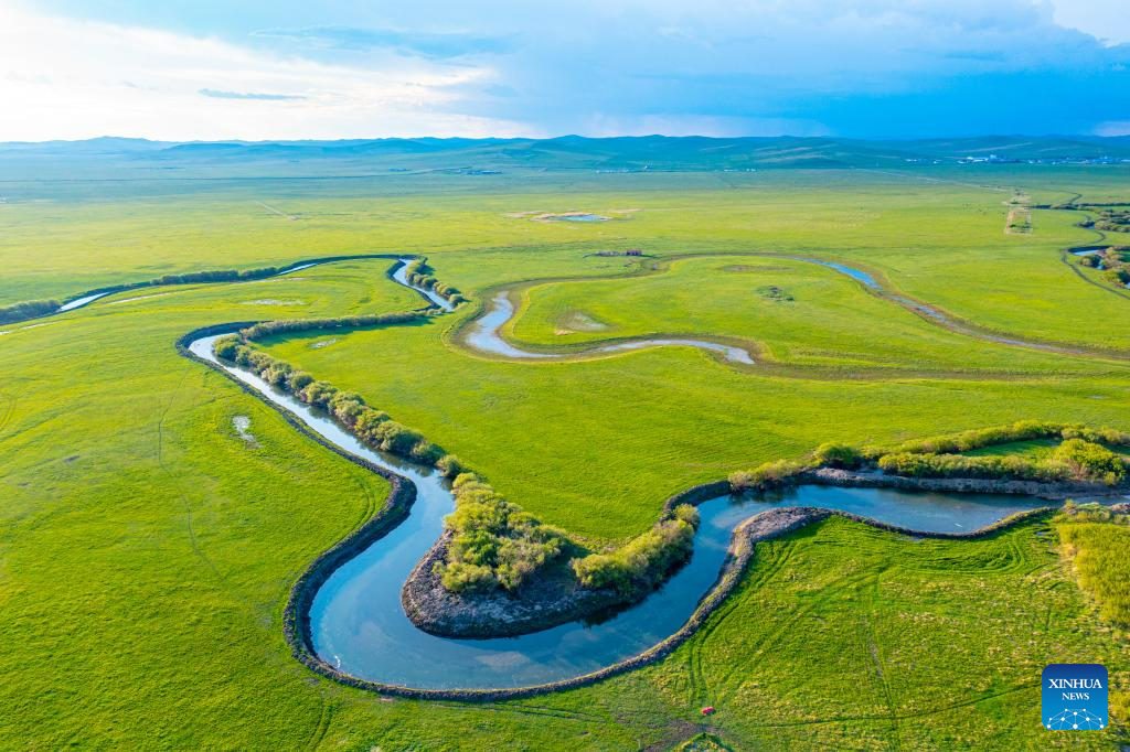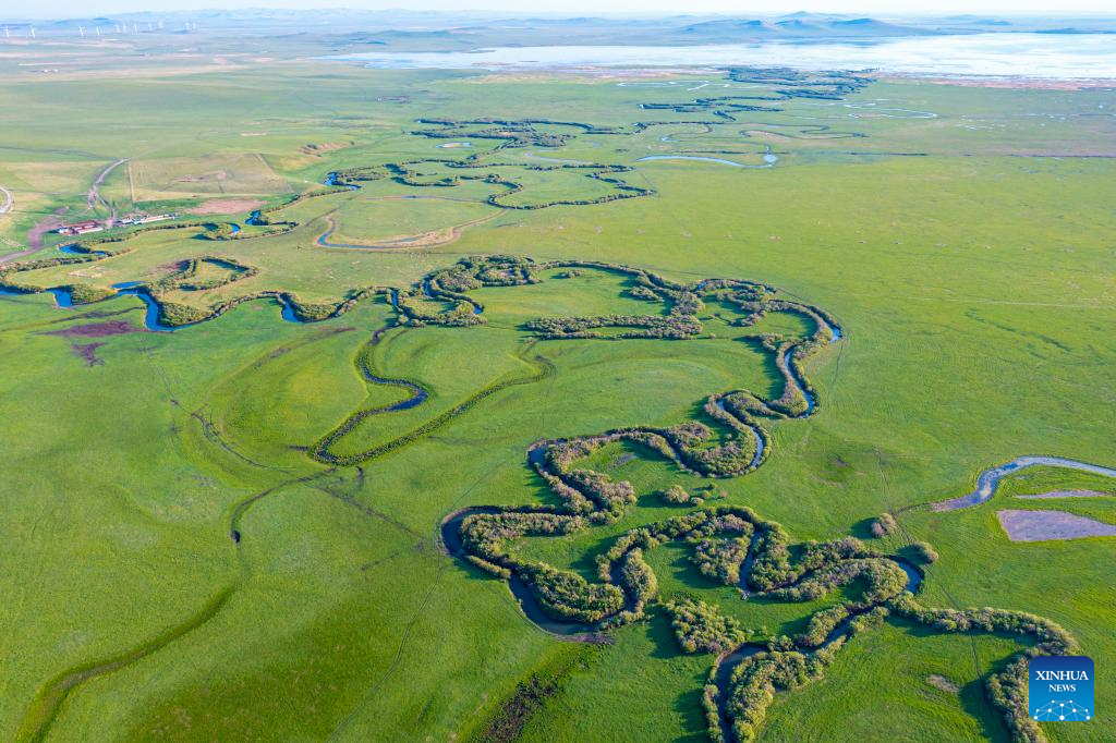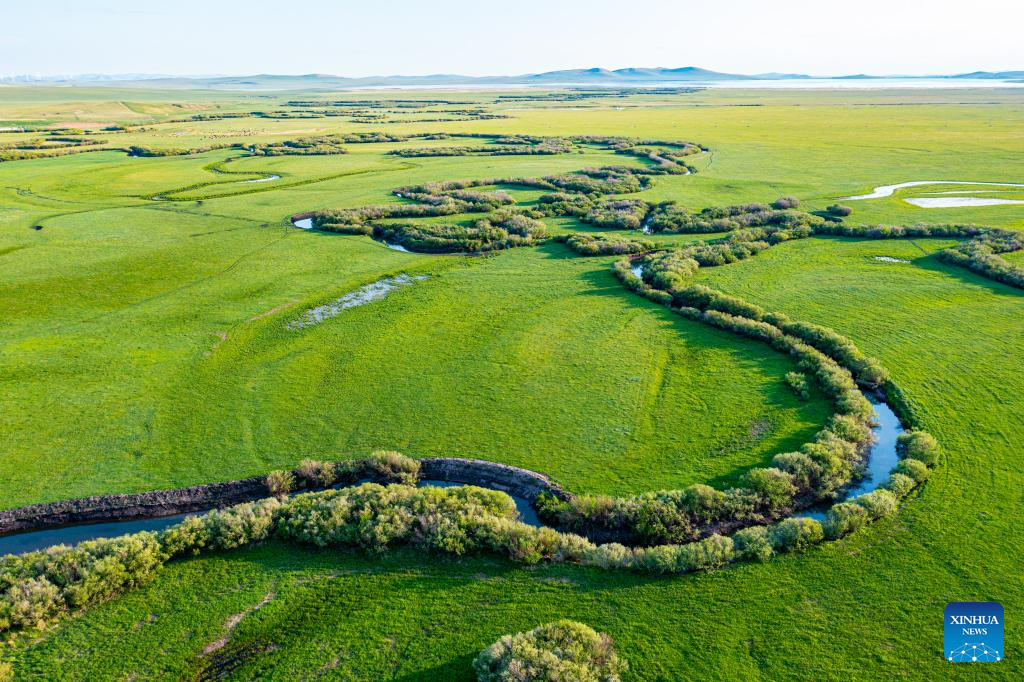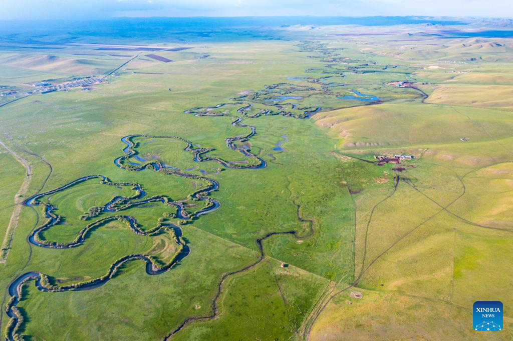 This aerial photo taken on June 12, 2023 shows the scenery of a grassland in Xilingol League of north China's Inner Mongolia Autonomous Region. (Xinhua/Peng Yuan)