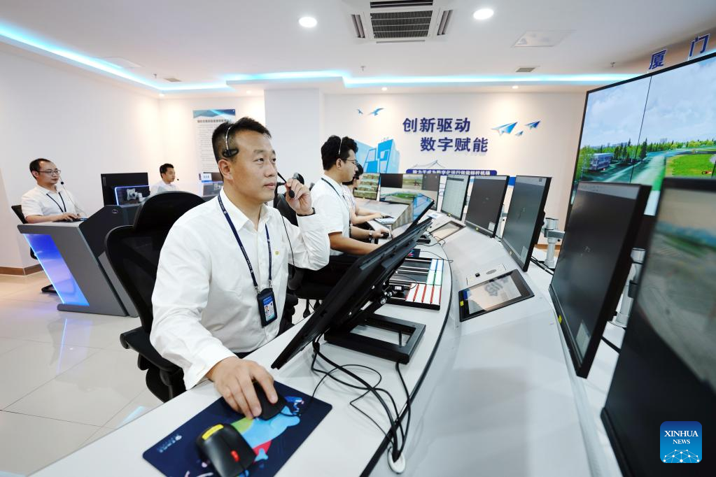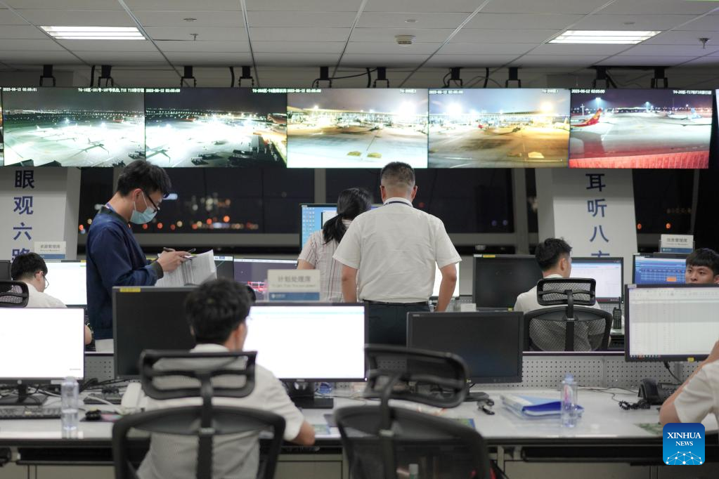 Staff members work with an integrated digital operation system at Xiamen Gaoqi International Airport in Xiamen, southeast China's Fujian Province, June 12, 2023. (Xiamen Gaoqi International Airport/Handout via Xinhua)