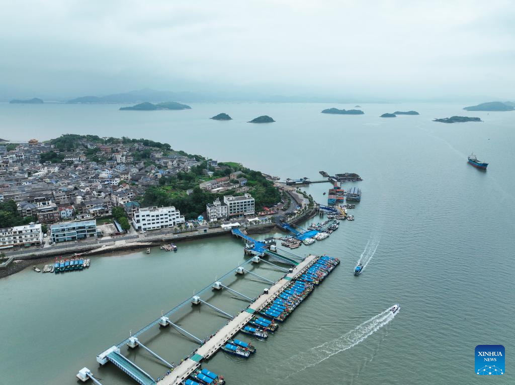This aerial photo taken on June 13, 2023 shows a view of Qiangjiao Town of Ninghai County, east China's Zhejiang Province. Qiangjiao is a marine peninsula town with rich natural and tourism resources. In recent years, the local government has made great efforts to promote all-in-one tourism, connecting islands, scenic spots, and villages, and has launched coastal tourism attractions, effectively boosting rural revitalization. (Xinhua/Weng Xinyang)