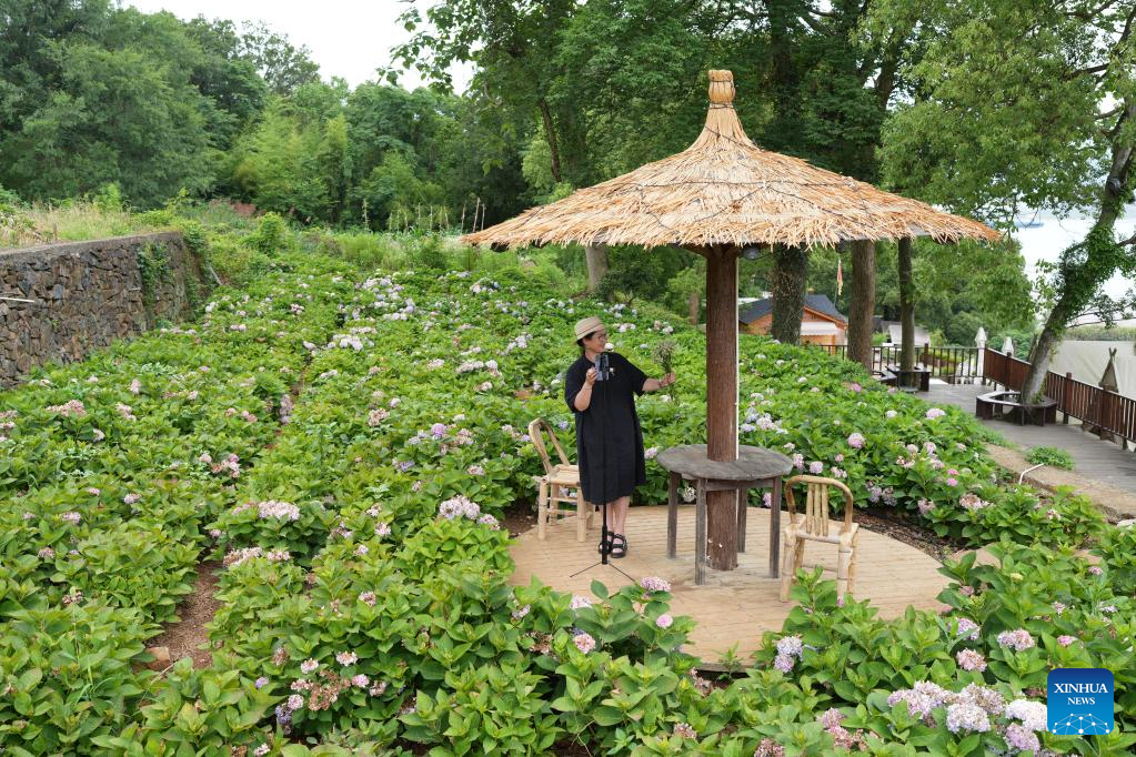 A woman livestreams at a flower field in Qiangjiao Town of Ninghai County, east China's Zhejiang Province, June 13, 2023. Qiangjiao is a marine peninsula town with rich natural and tourism resources. In recent years, the local government has made great efforts to promote all-in-one tourism, connecting islands, scenic spots, and villages, and has launched coastal tourism attractions, effectively boosting rural revitalization. (Xinhua/Weng Xinyang)
