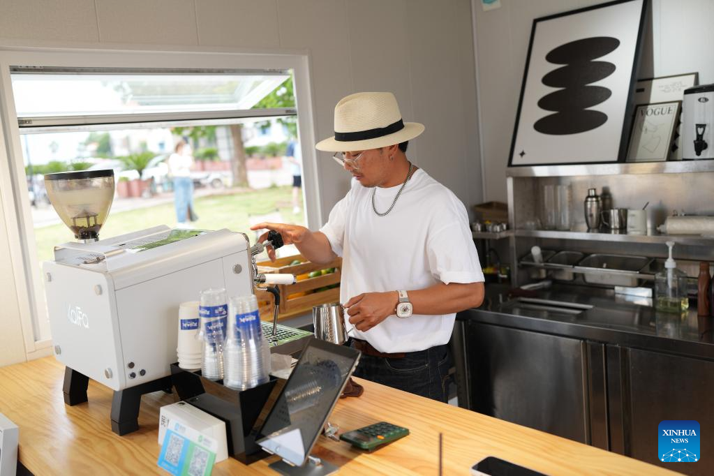 The owner of a coffee shop makes coffee for customers in Qiangjiao Town of Ninghai County, east China's Zhejiang Province, June 12, 2023. Qiangjiao is a marine peninsula town with rich natural and tourism resources. In recent years, the local government has made great efforts to promote all-in-one tourism, connecting islands, scenic spots, and villages, and has launched coastal tourism attractions, effectively boosting rural revitalization. (Xinhua/Weng Xinyang)