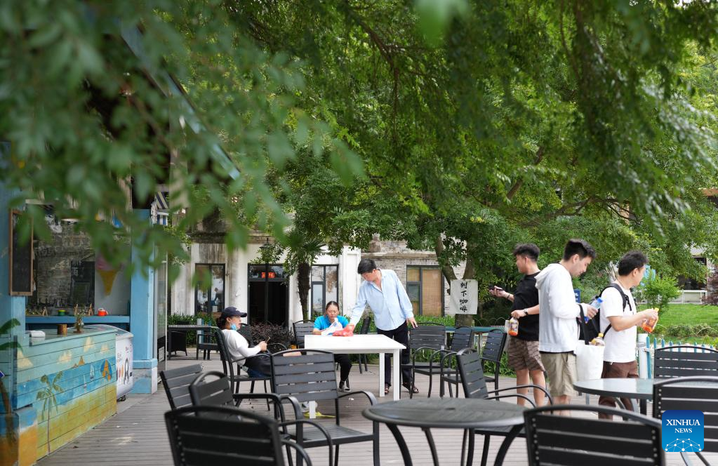 People rest at a beverage shop in Qiangjiao Town of Ninghai County, east China's Zhejiang Province, June 12, 2023. Qiangjiao is a marine peninsula town with rich natural and tourism resources. In recent years, the local government has made great efforts to promote all-in-one tourism, connecting islands, scenic spots, and villages, and has launched coastal tourism attractions, effectively boosting rural revitalization. (Xinhua/Weng Xinyang)