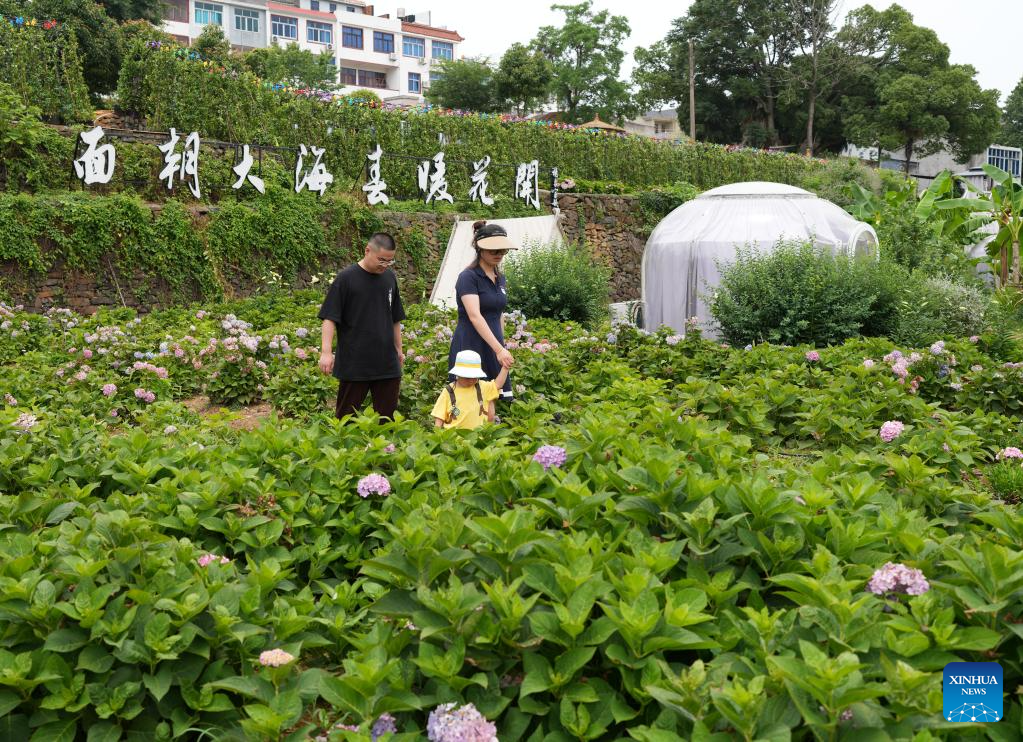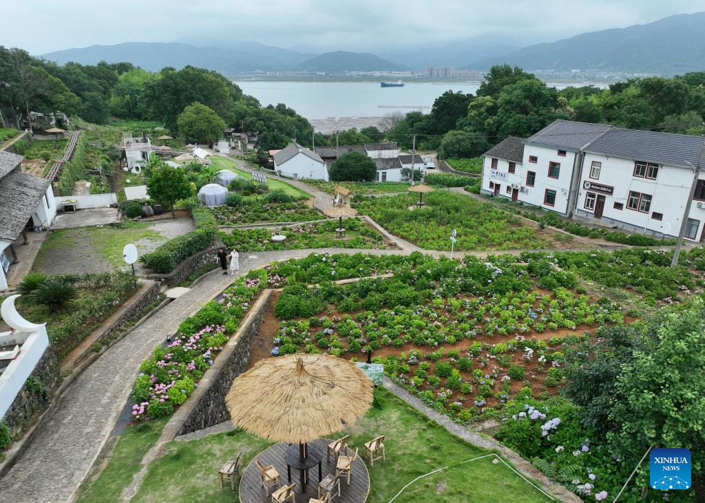 People visit a flower field in Qiangjiao Town of Ninghai County, east China's Zhejiang Province, June 13, 2023. Qiangjiao is a marine peninsula town with rich natural and tourism resources. In recent years, the local government has made great efforts to promote all-in-one tourism, connecting islands, scenic spots, and villages, and has launched coastal tourism attractions, effectively boosting rural revitalization. (Xinhua/Weng Xinyang)