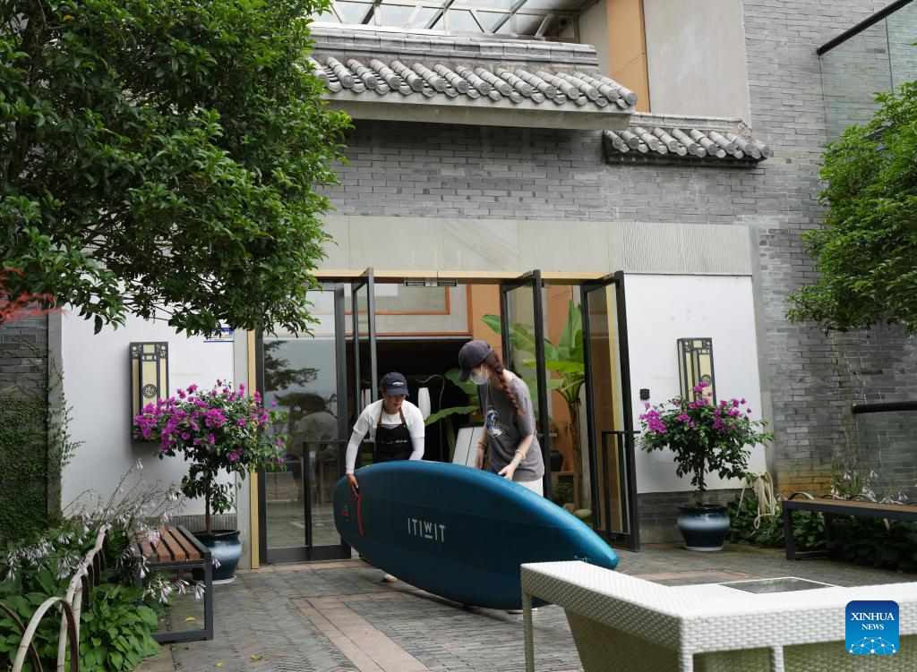 A worker of a homestay prepares a paddle board for a customer in Qiangjiao Town of Ninghai County, east China's Zhejiang Province, June 12, 2023. Qiangjiao is a marine peninsula town with rich natural and tourism resources. In recent years, the local government has made great efforts to promote all-in-one tourism, connecting islands, scenic spots, and villages, and has launched coastal tourism attractions, effectively boosting rural revitalization. (Xinhua/Weng Xinyang)