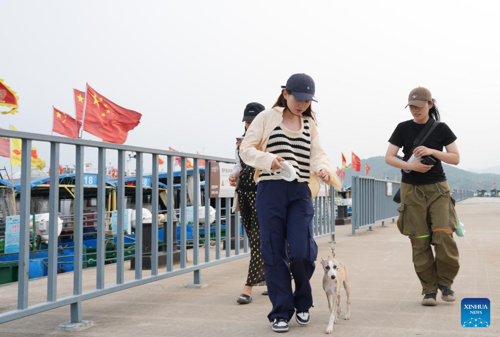 Tourists disembark from a ship after offshore sightseeing in Qiangjiao Town of Ninghai County, east China's Zhejiang Province, June 12, 2023. Qiangjiao is a marine peninsula town with rich natural and tourism resources. In recent years, the local government has made great efforts to promote all-in-one tourism, connecting islands, scenic spots, and villages, and has launched coastal tourism attractions, effectively boosting rural revitalization. (Xinhua/Weng Xinyang)