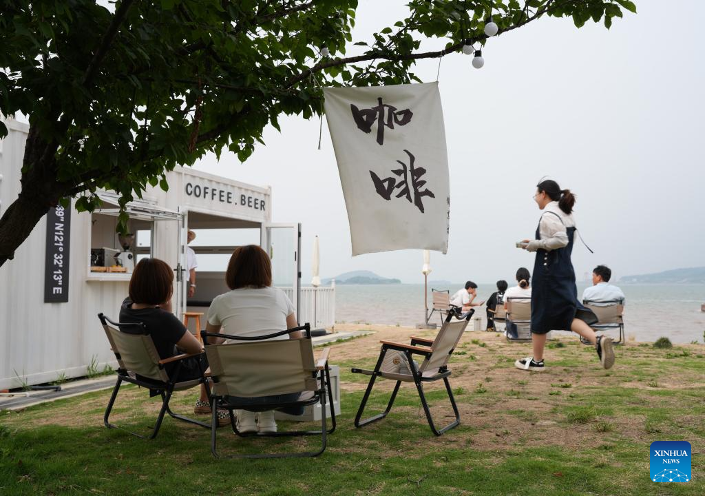 People rest at a coastal coffee shop in Qiangjiao Town of Ninghai County, east China's Zhejiang Province, June 12, 2023. Qiangjiao is a marine peninsula town with rich natural and tourism resources. In recent years, the local government has made great efforts to promote all-in-one tourism, connecting islands, scenic spots, and villages, and has launched coastal tourism attractions, effectively boosting rural revitalization. (Xinhua/Weng Xinyang)