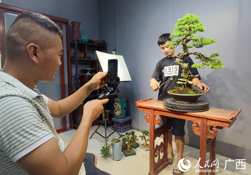 A man sells penjing trees, or Chinese bonsai trees, via livestream. (People's Daily Online/Wang Yong)
