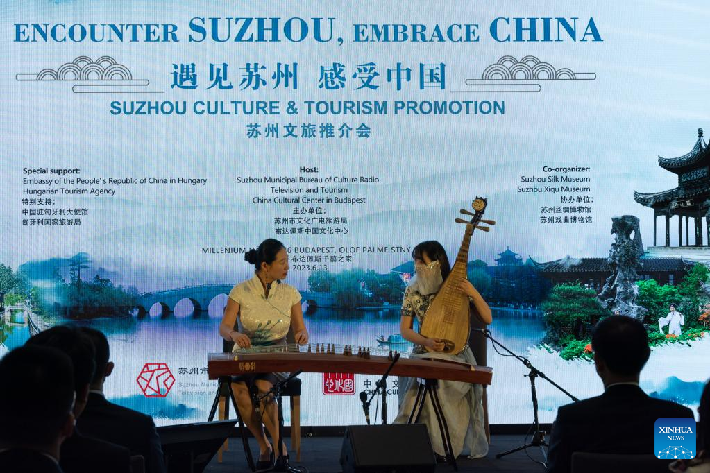Musicians play the traditional Chinese musical instruments at the Suzhou Culture and Tourism Promotion in Budapest, Hungary, on June 13, 2023. (Photo by Attila Volgyi/Xinhua)
