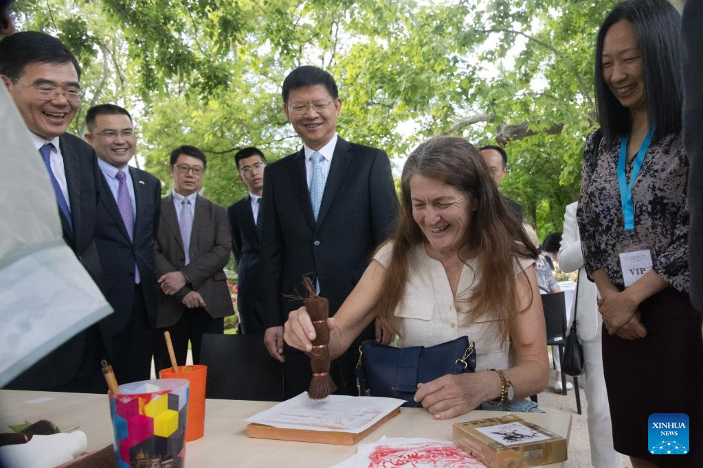 A visitor experiences traditional Chinese rubbing at the Suzhou Culture and Tourism Promotion in Budapest, Hungary, on June 13, 2023. (Photo by Attila Volgyi/Xinhua)