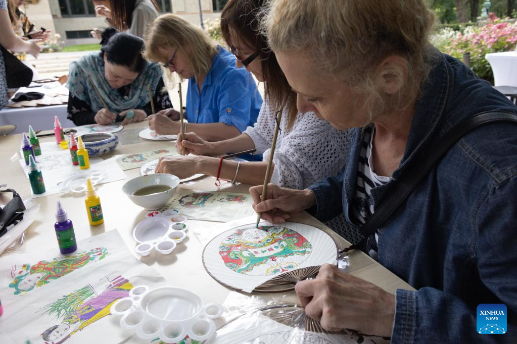 People learn to paint on traditional Chinese fans at the Suzhou Culture and Tourism Promotion in Budapest, Hungary, on June 13, 2023. (Photo by Attila Volgyi/Xinhua)