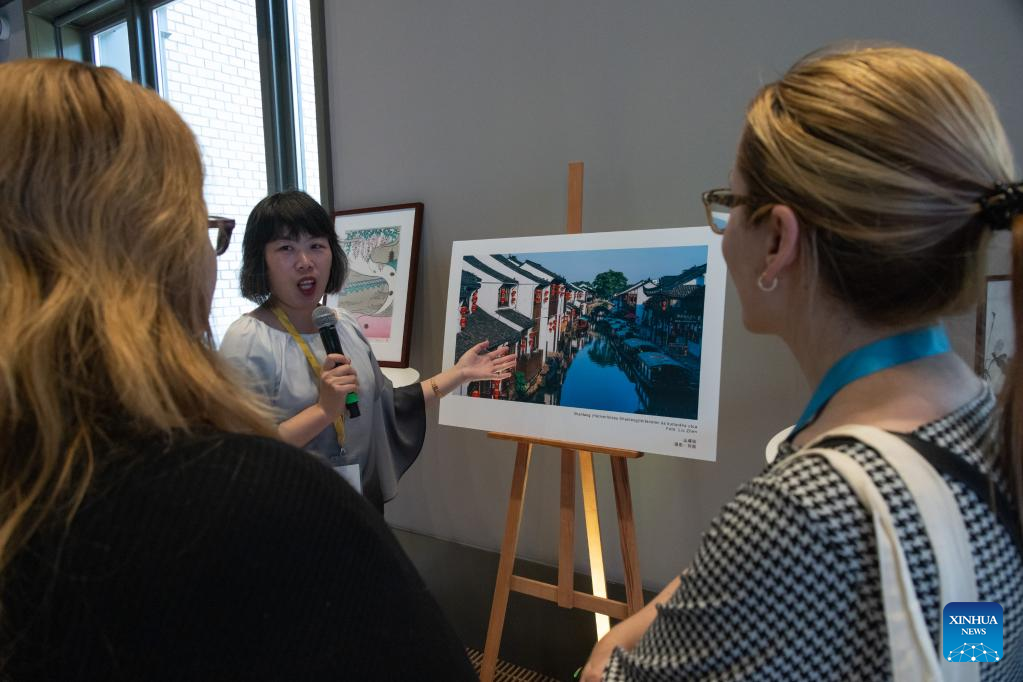 People visit a photo exhibition at the Suzhou Culture and Tourism Promotion in Budapest, Hungary, on June 13, 2023. (Photo by Attila Volgyi/Xinhua)