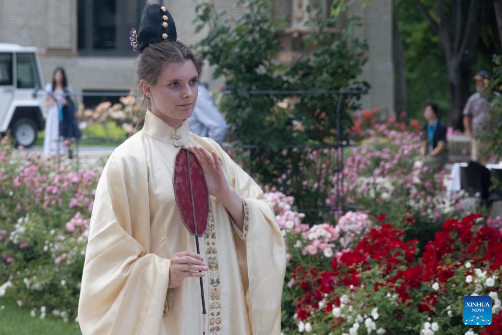 A volunteer presents a traditional Chinese dress at the Suzhou Culture and Tourism Promotion in Budapest, Hungary, on June 13, 2023. (Photo by Attila Volgyi/Xinhua)