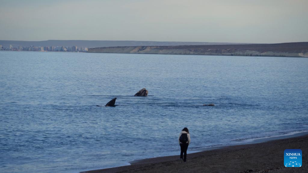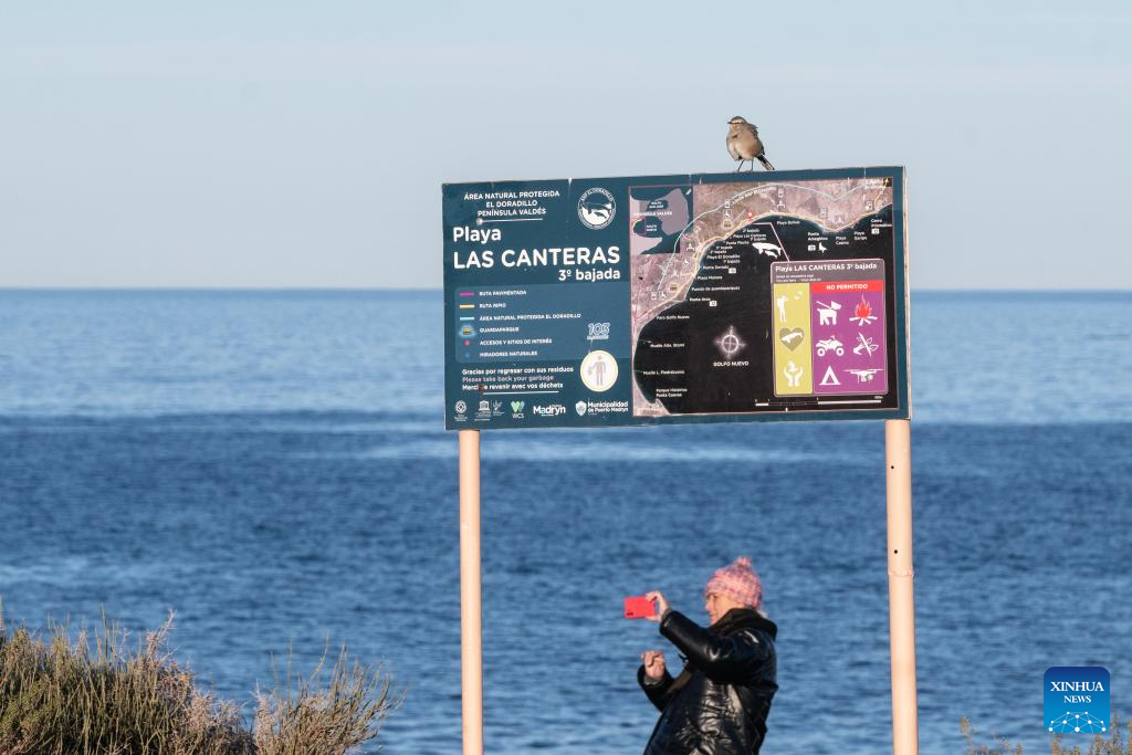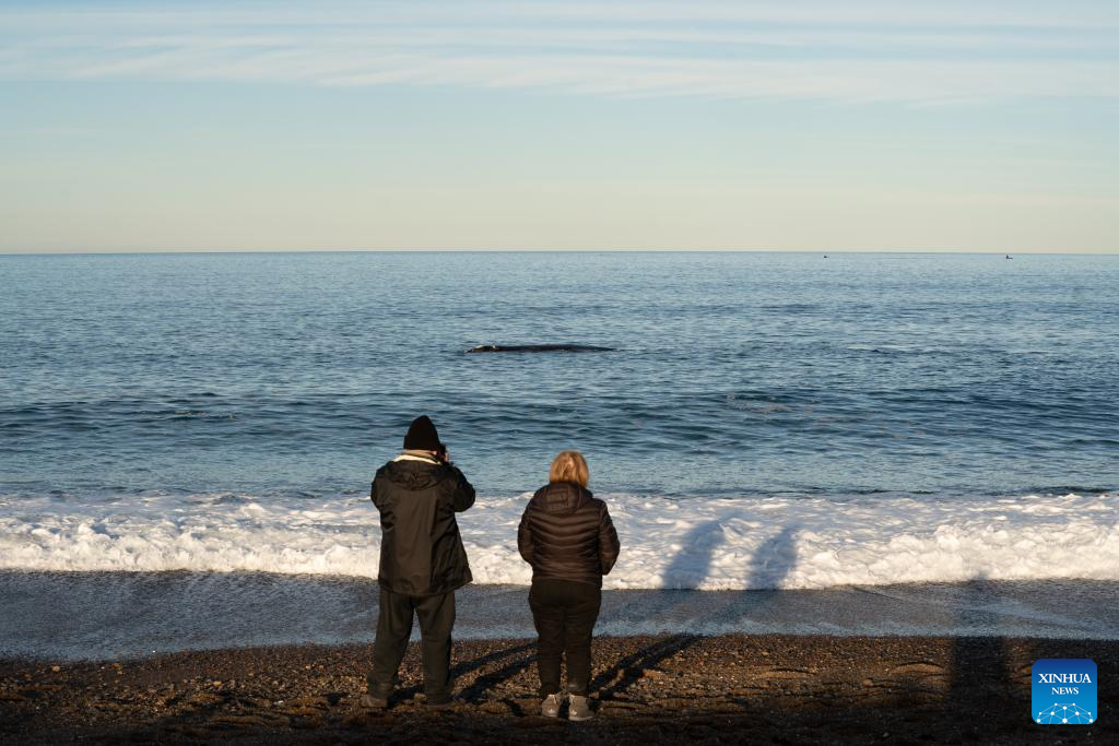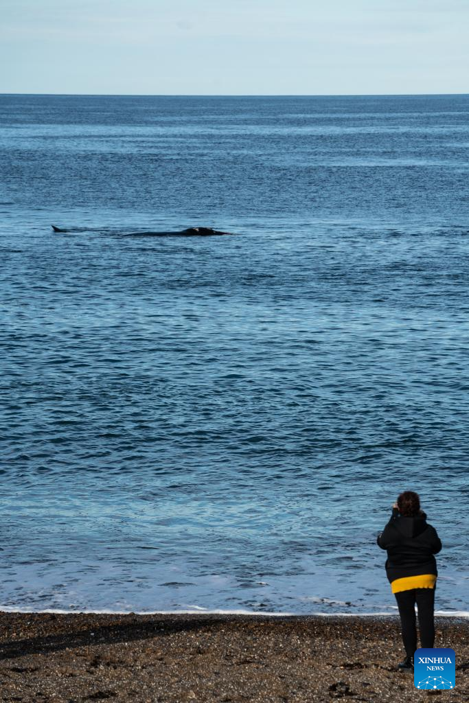 A tourist takes pictures at a beach in Puerto Madeleine, Argentina, on June 13, 2023. Thousands of whales come to breed and calve here between June and December every year. (Xinhua/Wang Tiancong)