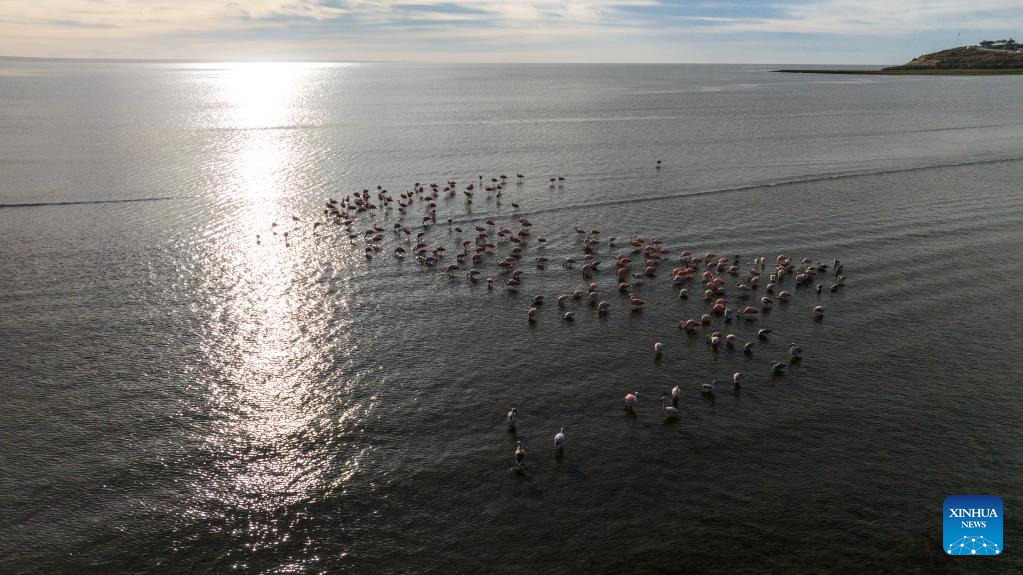 This aerial photo taken on June 13, 2023 shows flamingos in Puerto Madryn, Argentina. Thousands of whales come to breed and calve here between June and December every year. (Xinhua/Wang Tiancong)