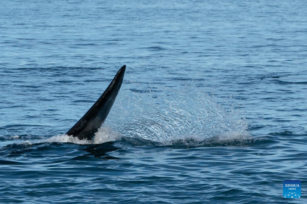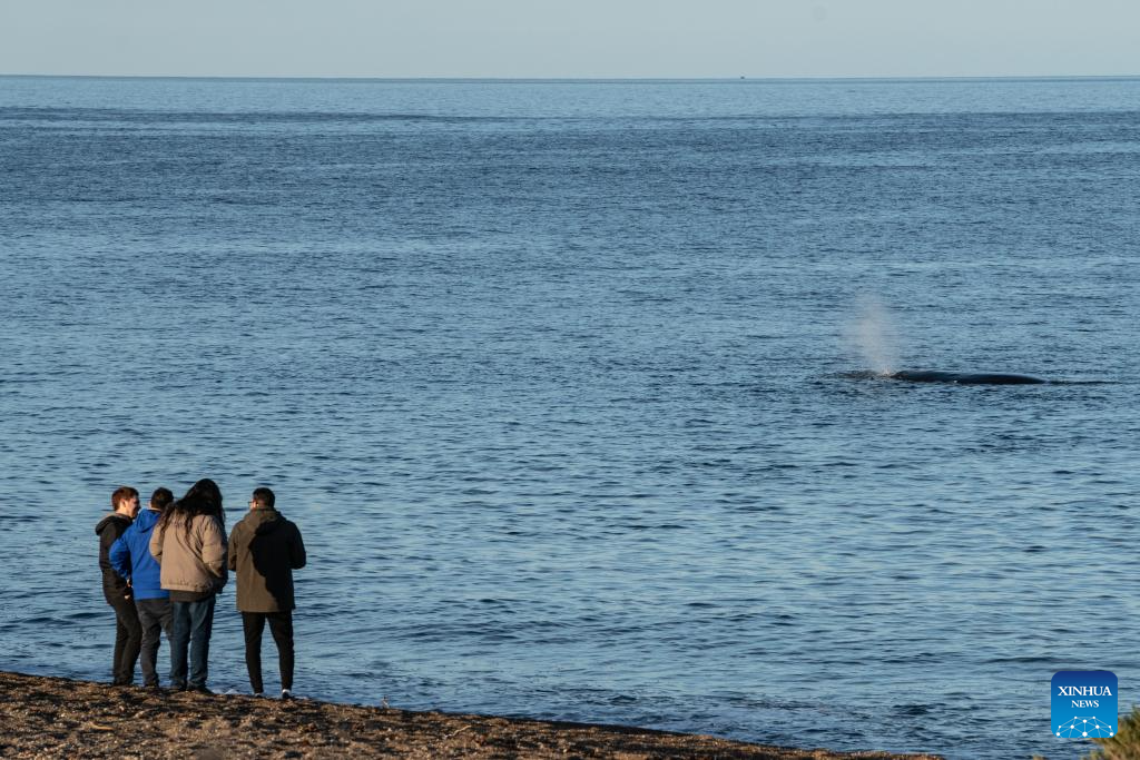 Tourist observe southern right whales in Puerto Madryn, Argentina, on June 13, 2023. Thousands of whales come to breed and calve here between June and December every year. (Xinhua/Wang Tiancong)