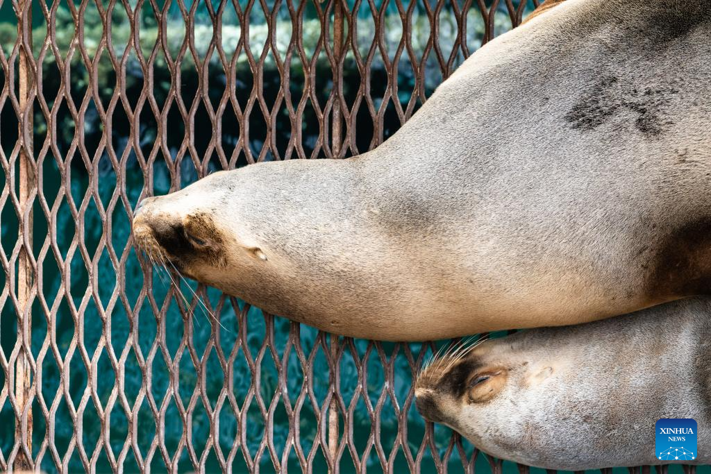 Two sea lions rest at a dock in Puerto Madryn, Argentina, on June 13, 2023. Thousands of whales come to breed and calve here between June and December every year. (Xinhua/Wang Tiancong)