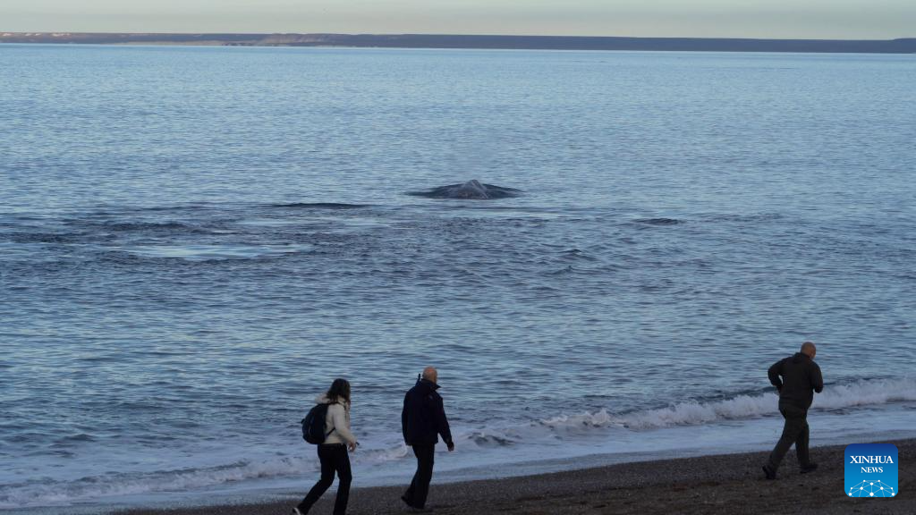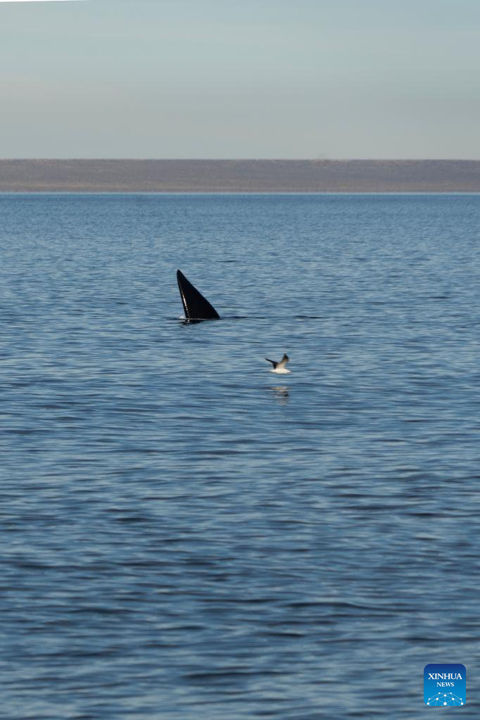 This photo taken on June 13, 2023 shows a southern right whale in Puerto Madryn, Argentina. Thousands of whales come to breed and calve here between June and December every year. (Xinhua/Wang Tiancong)