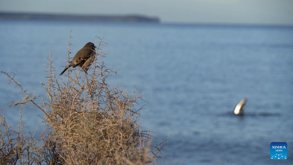 A bird perches on a branch in Puerto Madryn, Argentina, on June 13, 2023. Thousands of whales come to breed and calve here between June and December every year. (Xinhua/Wang Zhongyi)