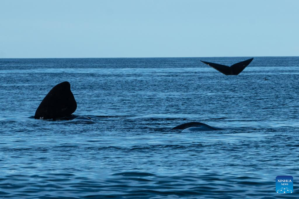 This photo taken on June 13, 2023 shows southern right whales in Puerto Madryn, Argentina. Thousands of whales come to breed and calve here between June and December every year. (Xinhua/Wang Tiancong)
