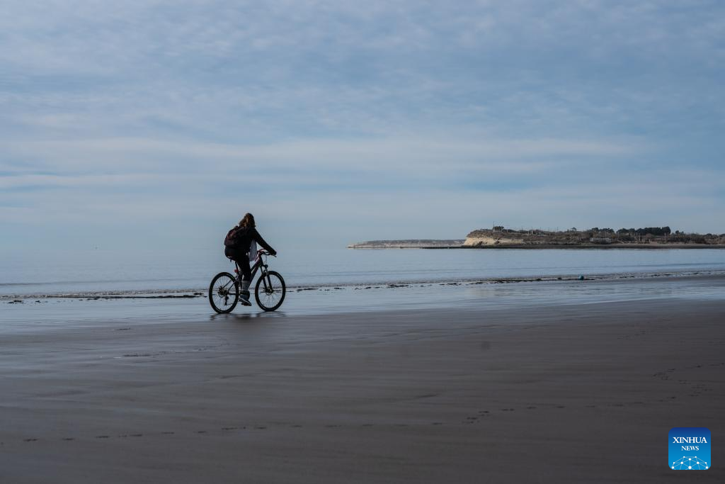 A woman rides a bike on a beach in Puerto Madryn, Argentina, on June 13, 2023. Thousands of whales come to breed and calve here between June and December every year. (Xinhua/Wang Tiancong)