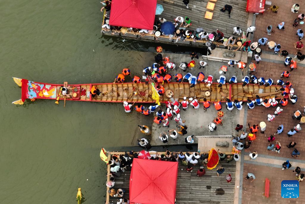 This aerial photo shows a dragon boat being pushed into water during a cultural event to celebrate the upcoming Dragon Boat Festival in Putian, southeast China's Fujian Province, June 13, 2023. A series of cultural events is going to be held in Putian to celebrate the traditional Dragon Boat Festival, which falls on June 22 this year. (Xinhua/Wei Peiquan)