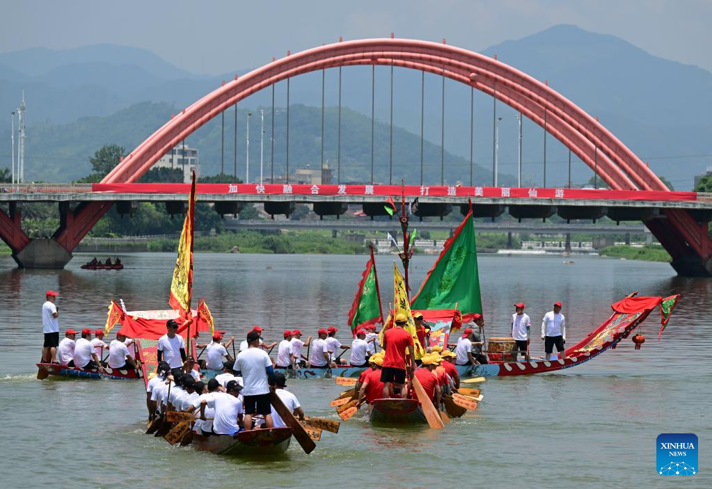 People row dragon boats during a cultural event to celebrate the upcoming Dragon Boat Festival in Putian, southeast China's Fujian Province, June 13, 2023. A series of cultural events is going to be held in Putian to celebrate the traditional Dragon Boat Festival, which falls on June 22 this year. (Xinhua/Wei Peiquan)