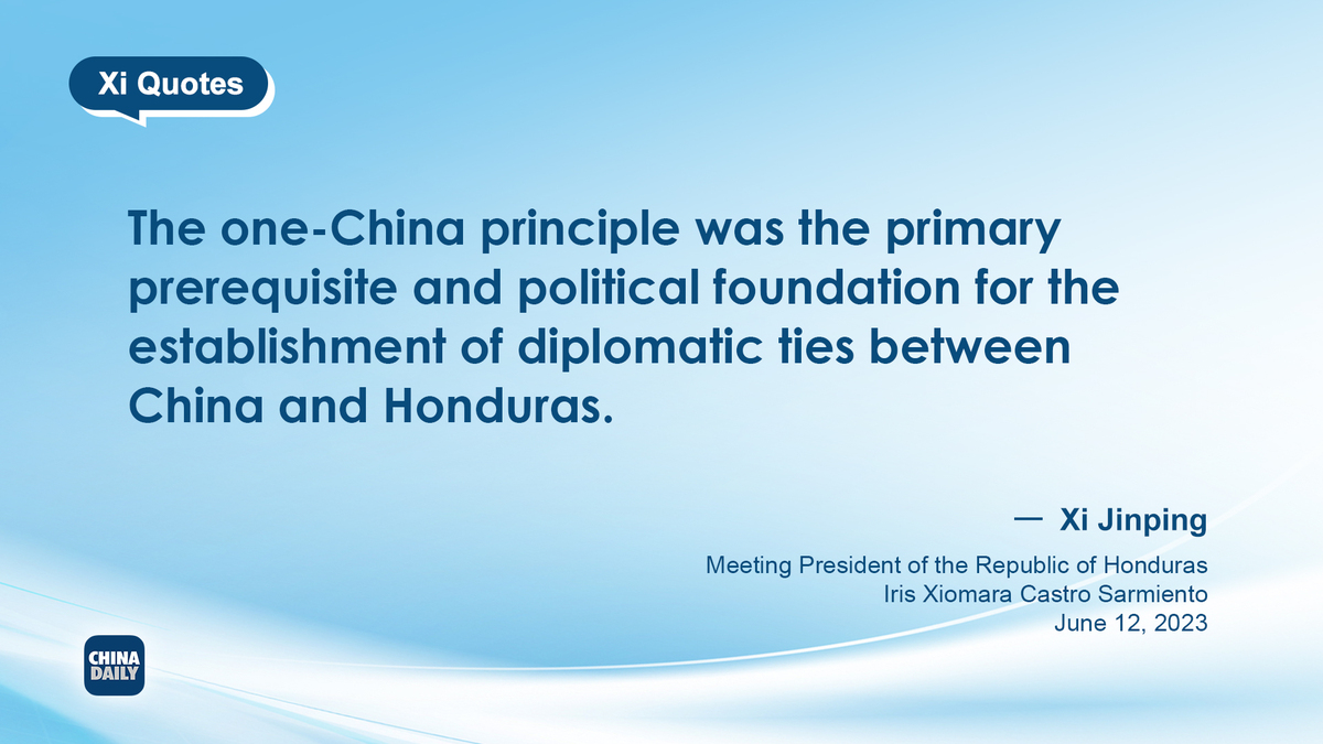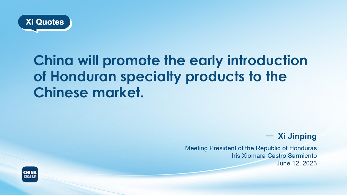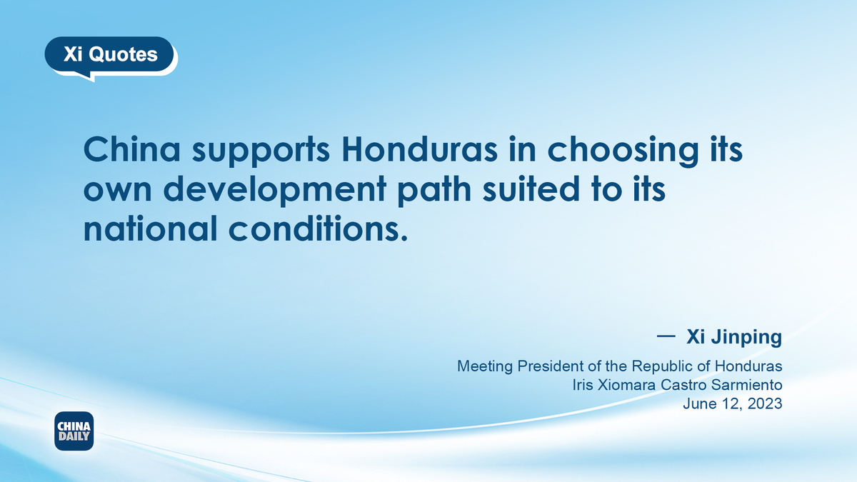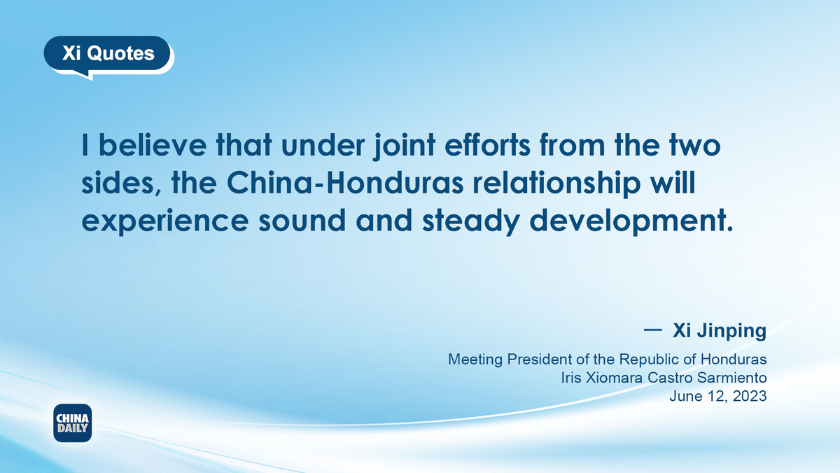 President Xi Jinping held talks with visiting President of the Republic of Honduras Iris Xiomara Castro Sarmiento in Beijing on Monday. Here are some highlights from Xi's comments on the development of the bilateral relationship.